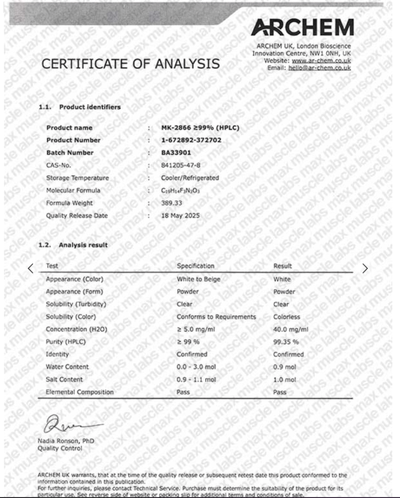 Before anything else, look at the Certificate of Analysis (COA) for your SARM.
